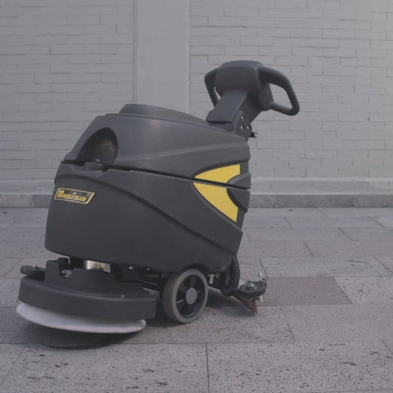 Nuestra restregadora de pisos industrial M35B cuenta con un sistema de aplicación de agua, restregado y aspirado de líquidos, dejando los pisos limpios y secos en una pasada. Lava hasta 1,500 m² por hora con autonomía por ciclo de 1.5 horas sin necesidad de cables, y puede trabajar en zonas de difícil acceso.