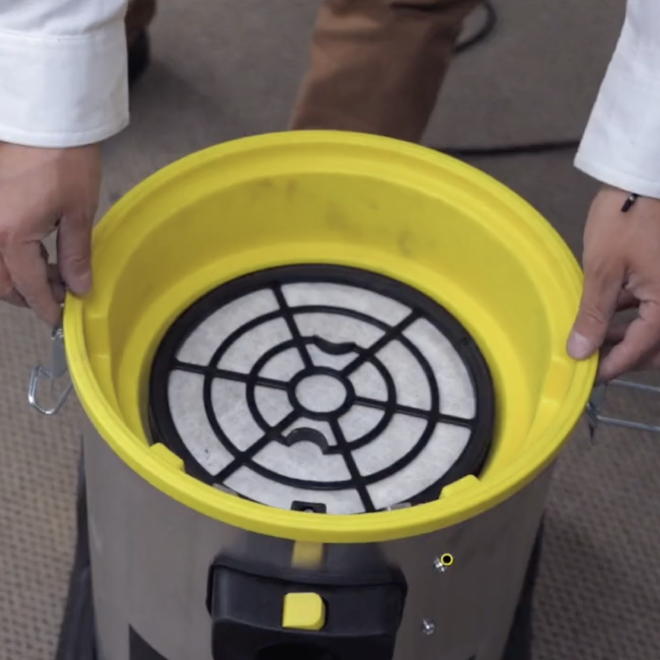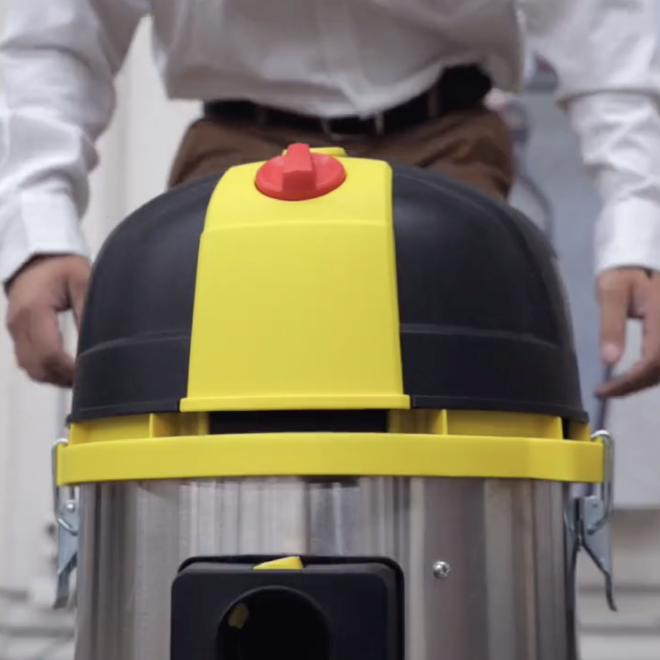 Nuestra aspiradora industrial Maid 35-WD es la única en el mercado con 6 etapas de filtración (filtración ciclónica de 6 etapas). Aspira sólidos y líquidos.